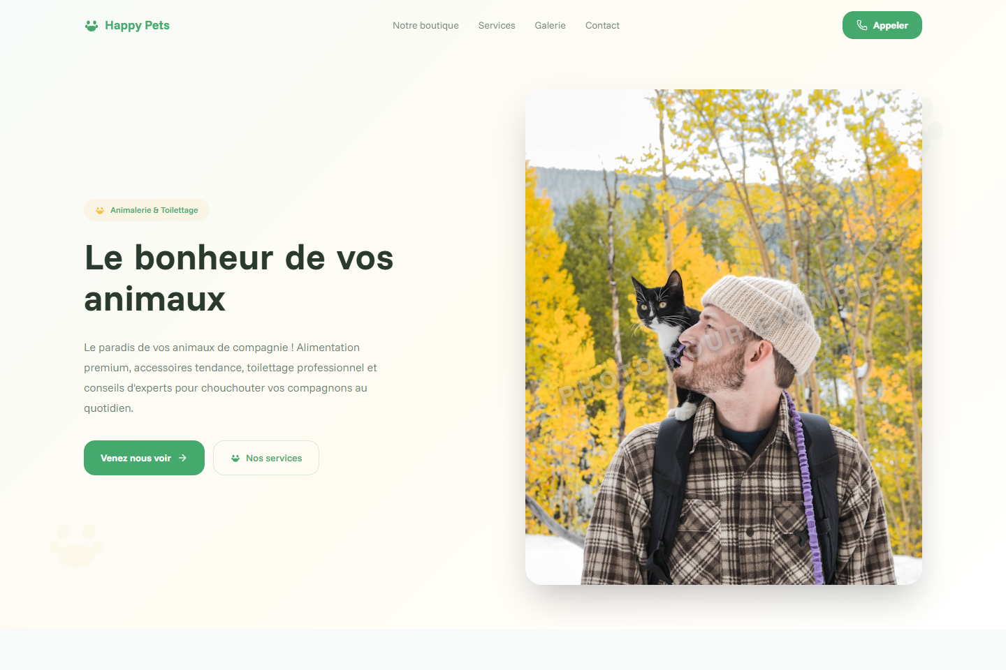 Design fun et vivant avec Funnel Sans bold, paw prints, palette vert & jaune et bounce animations.