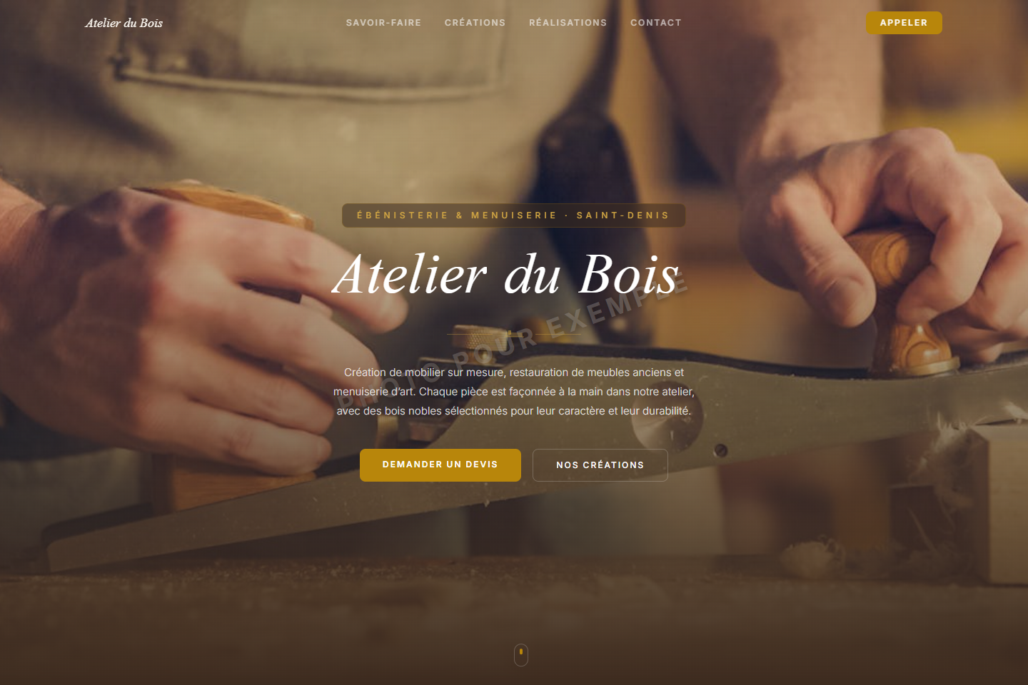 Design chaleureux avec Newsreader italic, motif rabot SVG, palette bois & doré et texture veinage.