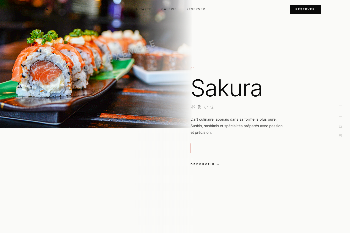 Design zen minimaliste avec nav verticale kanji, carte en scroll horizontal et parcours omakase numéroté.