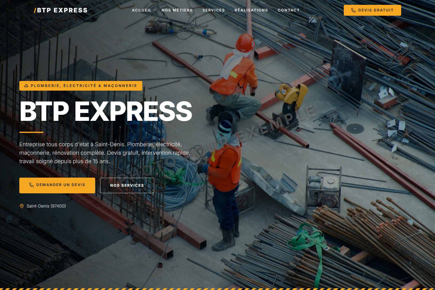 Design industriel robuste avec Inter bold, chevrons diagonaux, palette gris béton & jaune chantier.