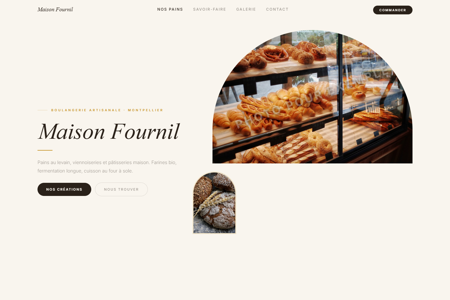 Design en arches récurrentes, Newsreader italic, photos qui sortent du four avec clip-path.