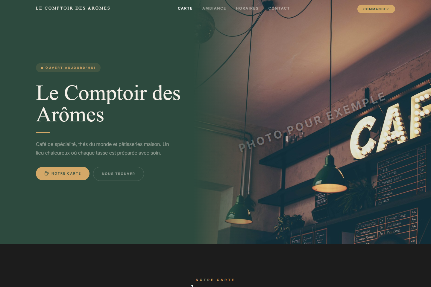 Ambiance cosy avec carte tableau noir, onglets interactifs et design vert profond & cuivre.
