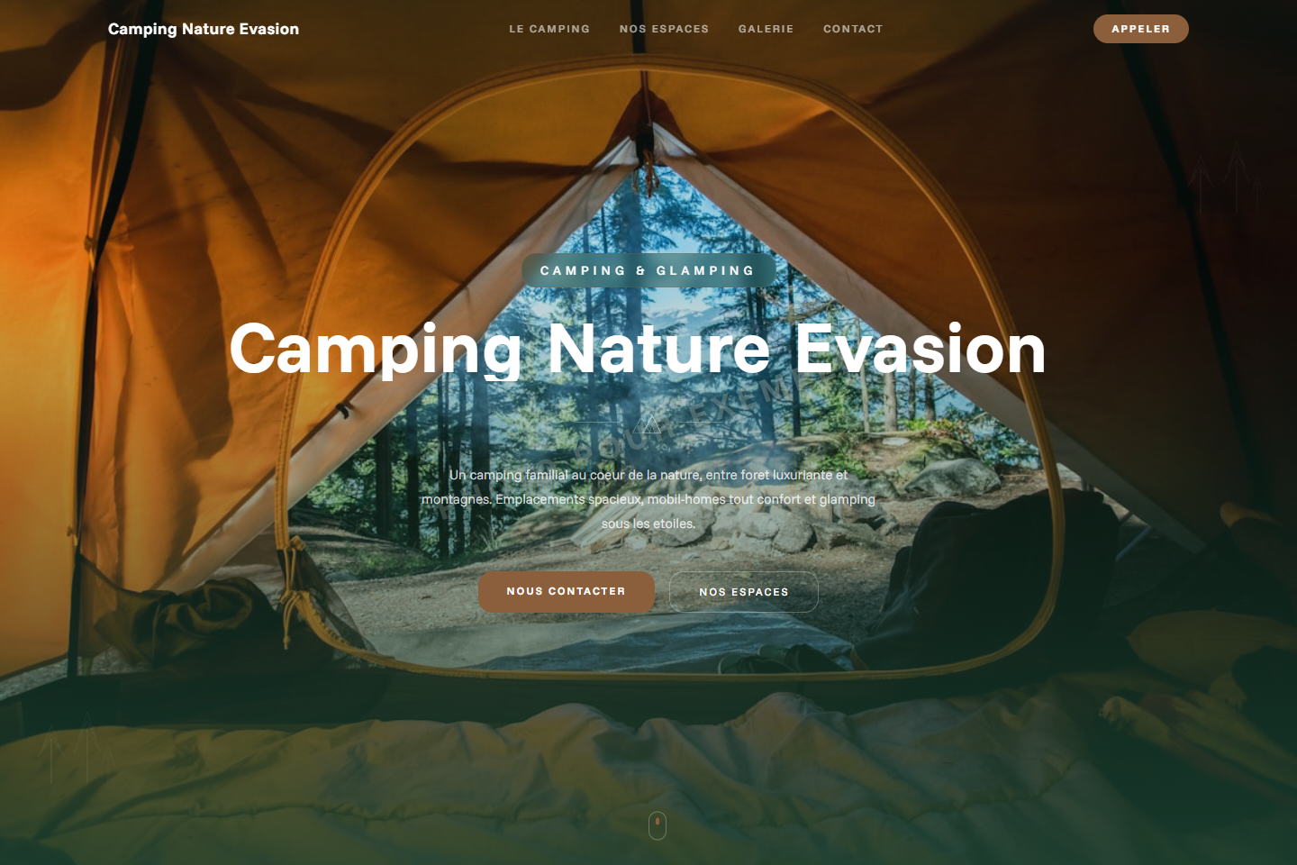 Design plein air avec Funnel Sans, tente SVG, palette vert forêt & sable.
