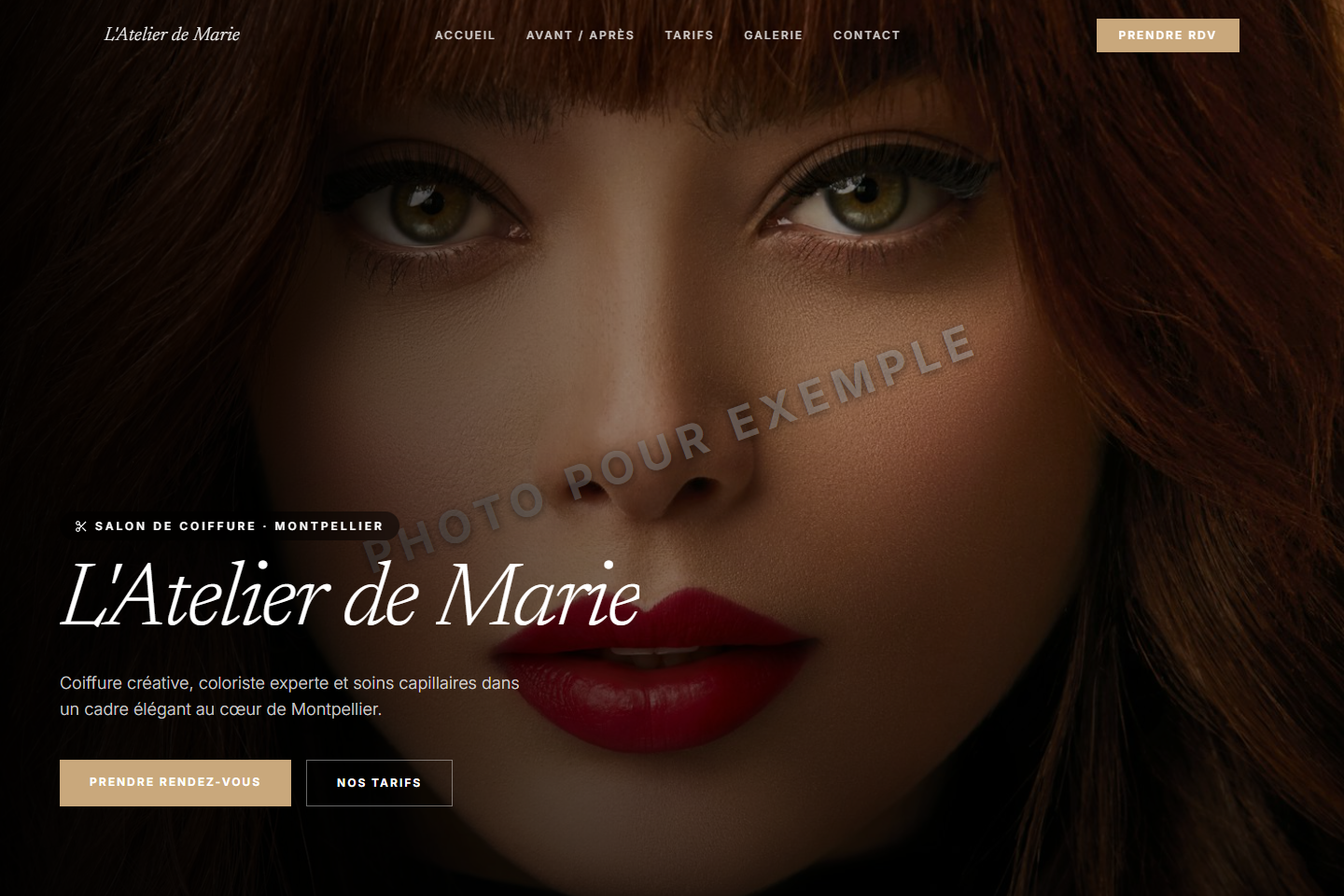 Style éditorial mode avec slider Before/After interactif, portfolio XXL asymétrique et tarifs élégants.