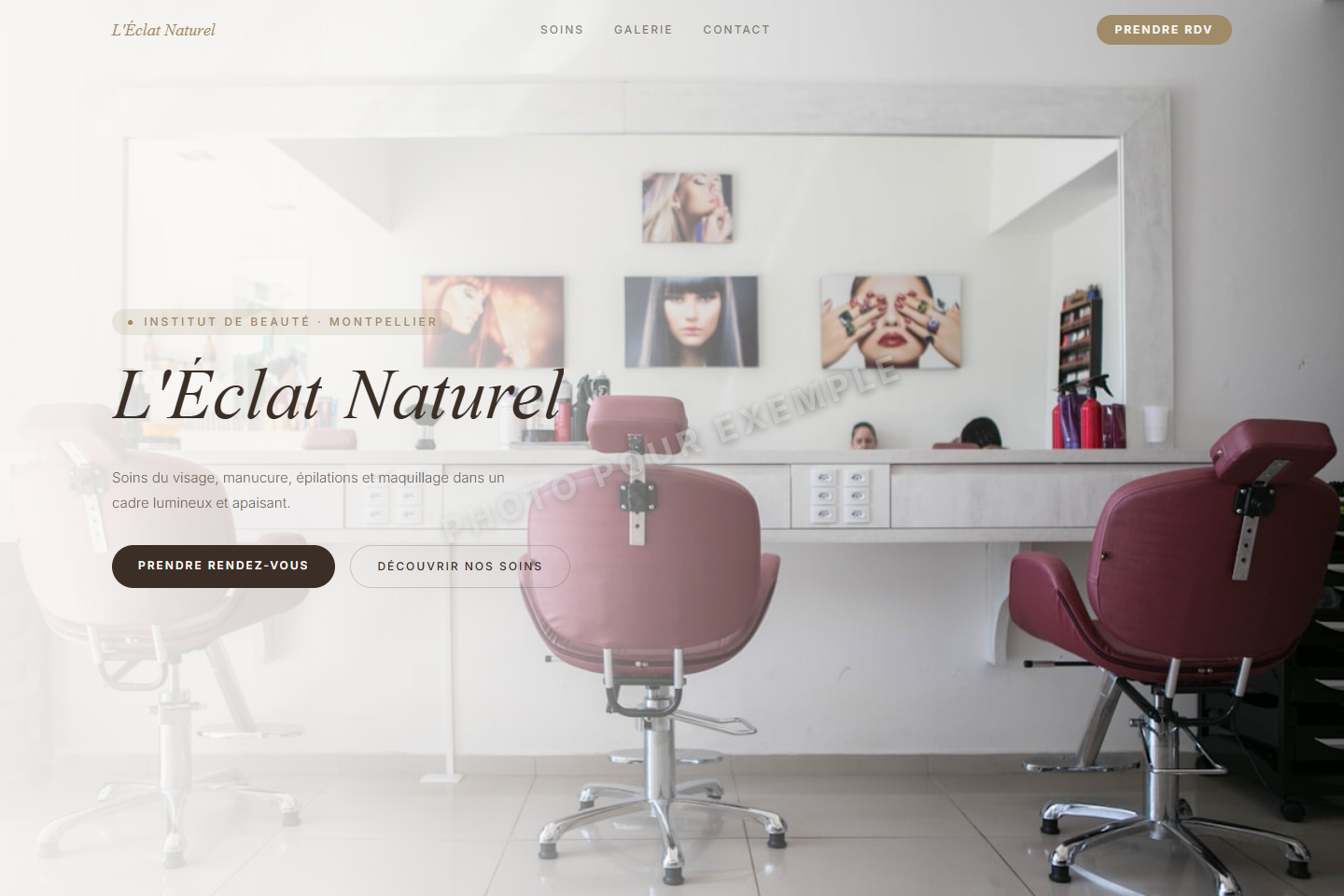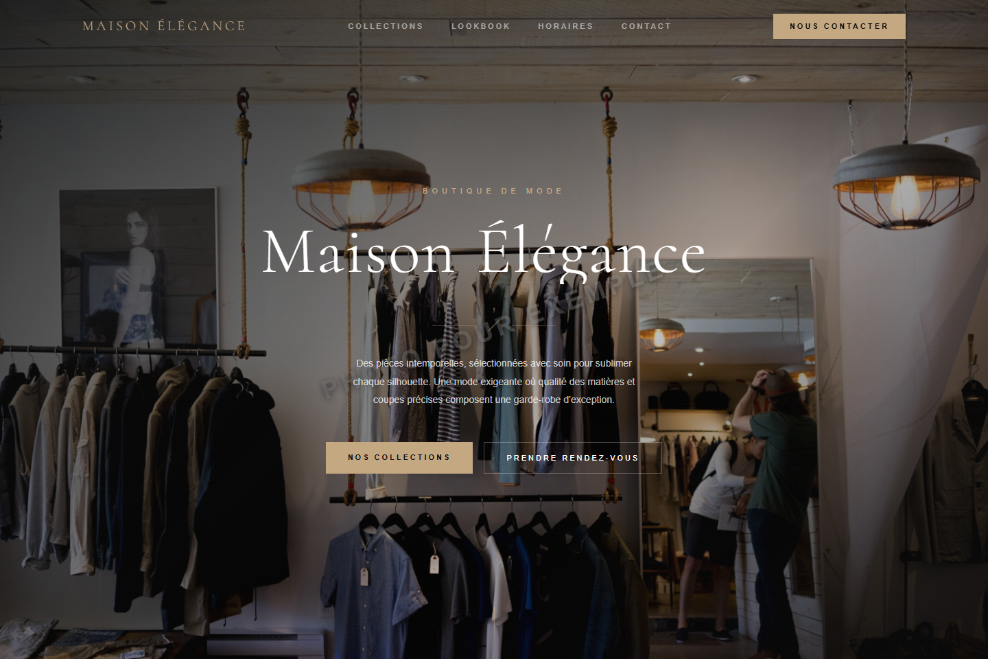 Design clair chic avec galerie masonry, palette beige/taupe/or et animations premium.