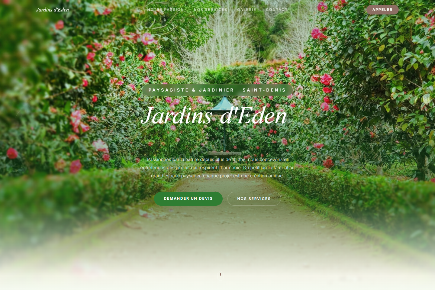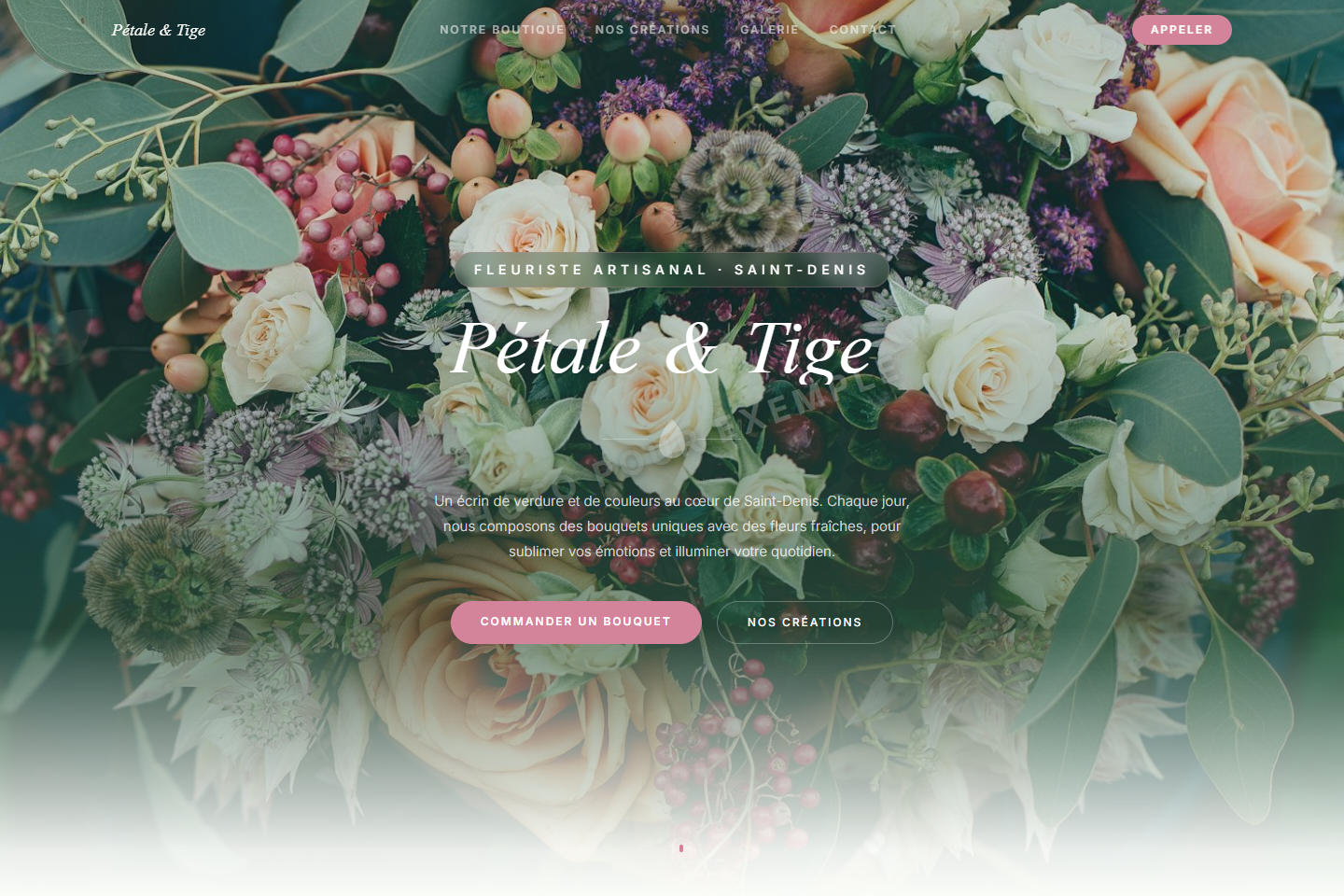 Design romantique avec Newsreader italic, pétales SVG, palette vert & rose et reveals organiques.