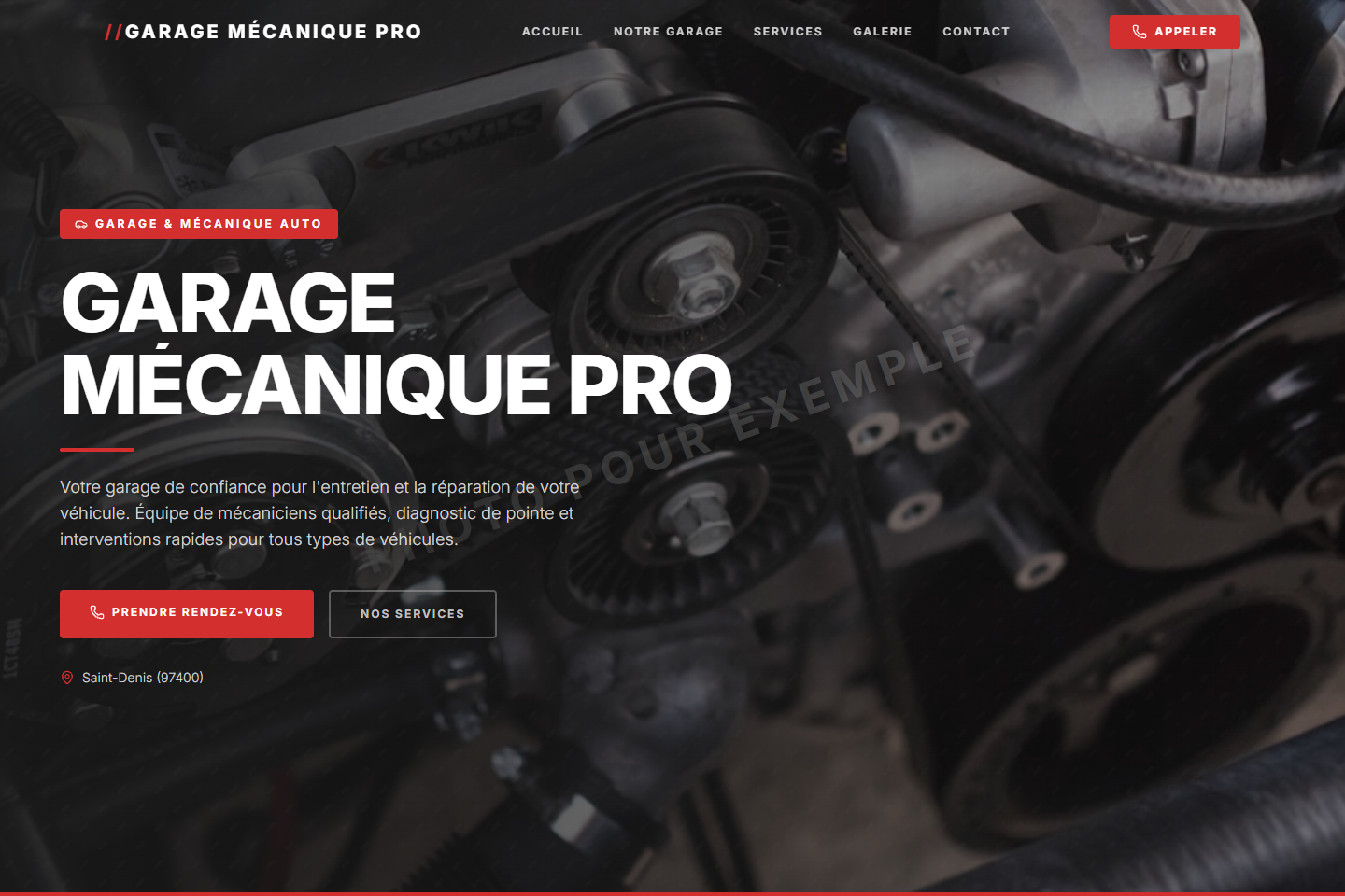 Design industriel sombre avec Inter bold, clé à molette SVG, palette noir & rouge mécanique.