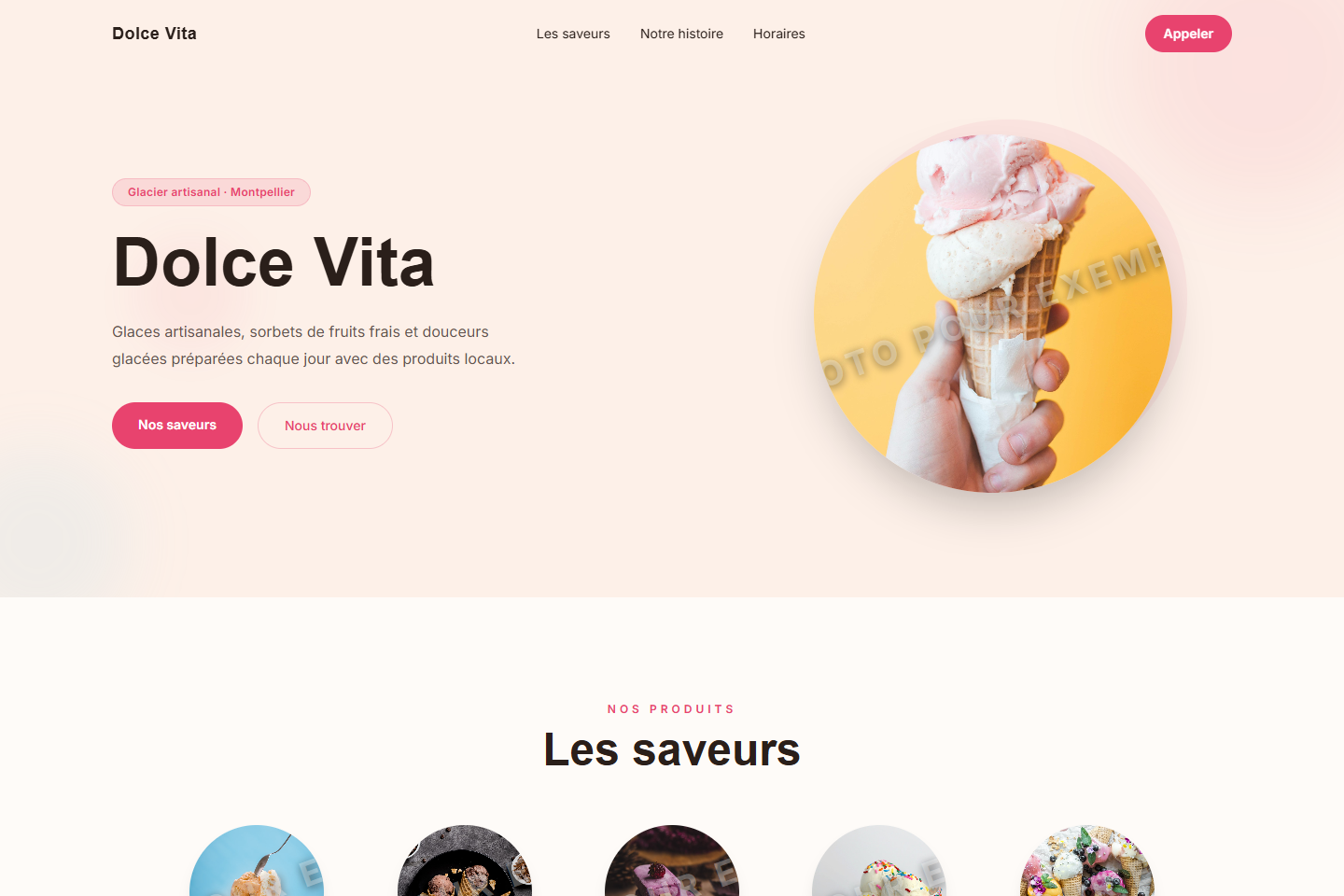 Design pastel et gourmand avec photos en cercles, palette rose vif et ambiance fraîche.