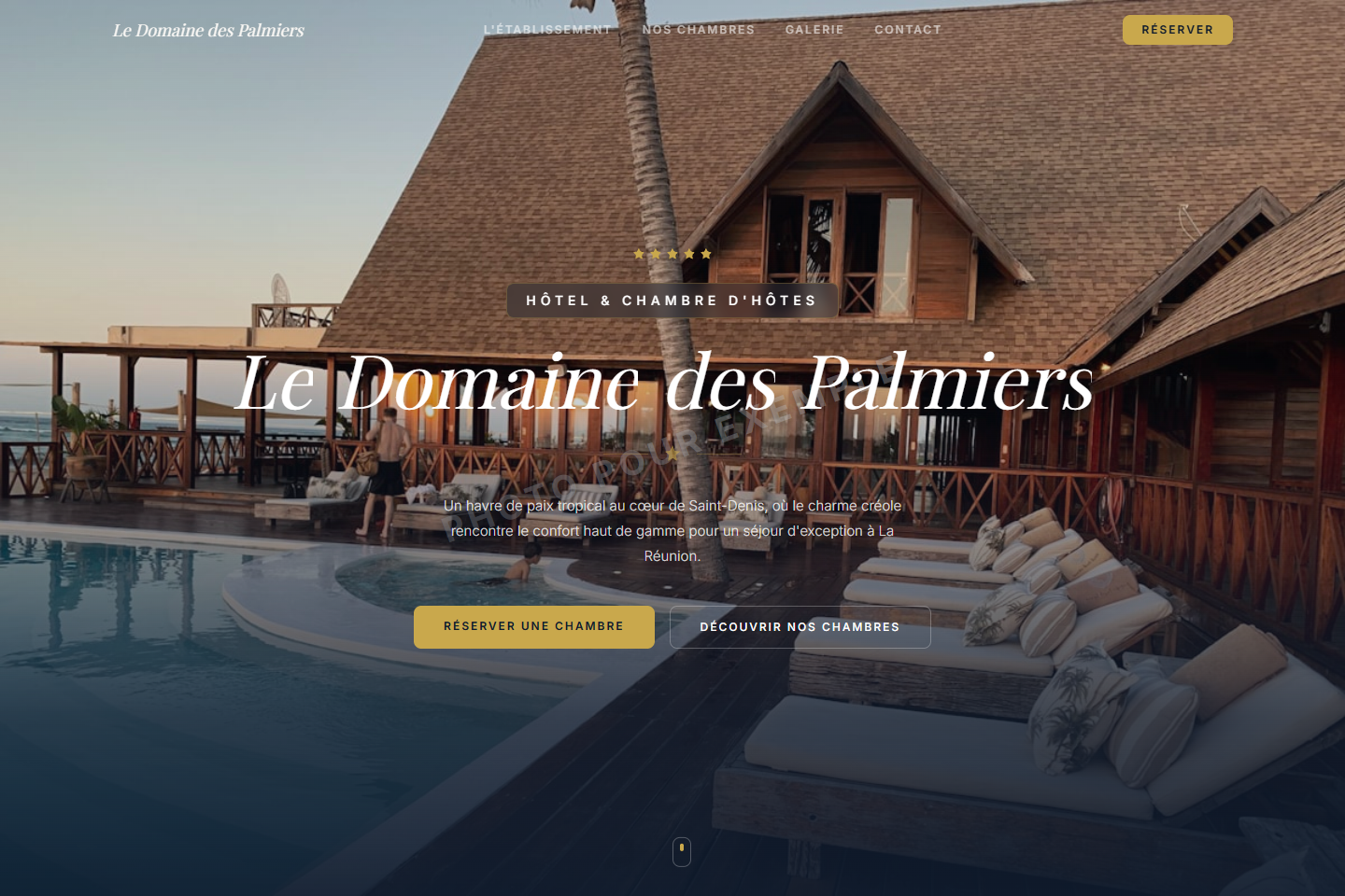 Design luxe hôtelier avec Playfair Display, étoiles SVG, palette bleu nuit & or.
