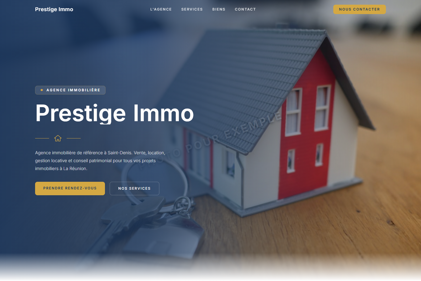 Design premium avec Inter, maison SVG, palette bleu marine & or.