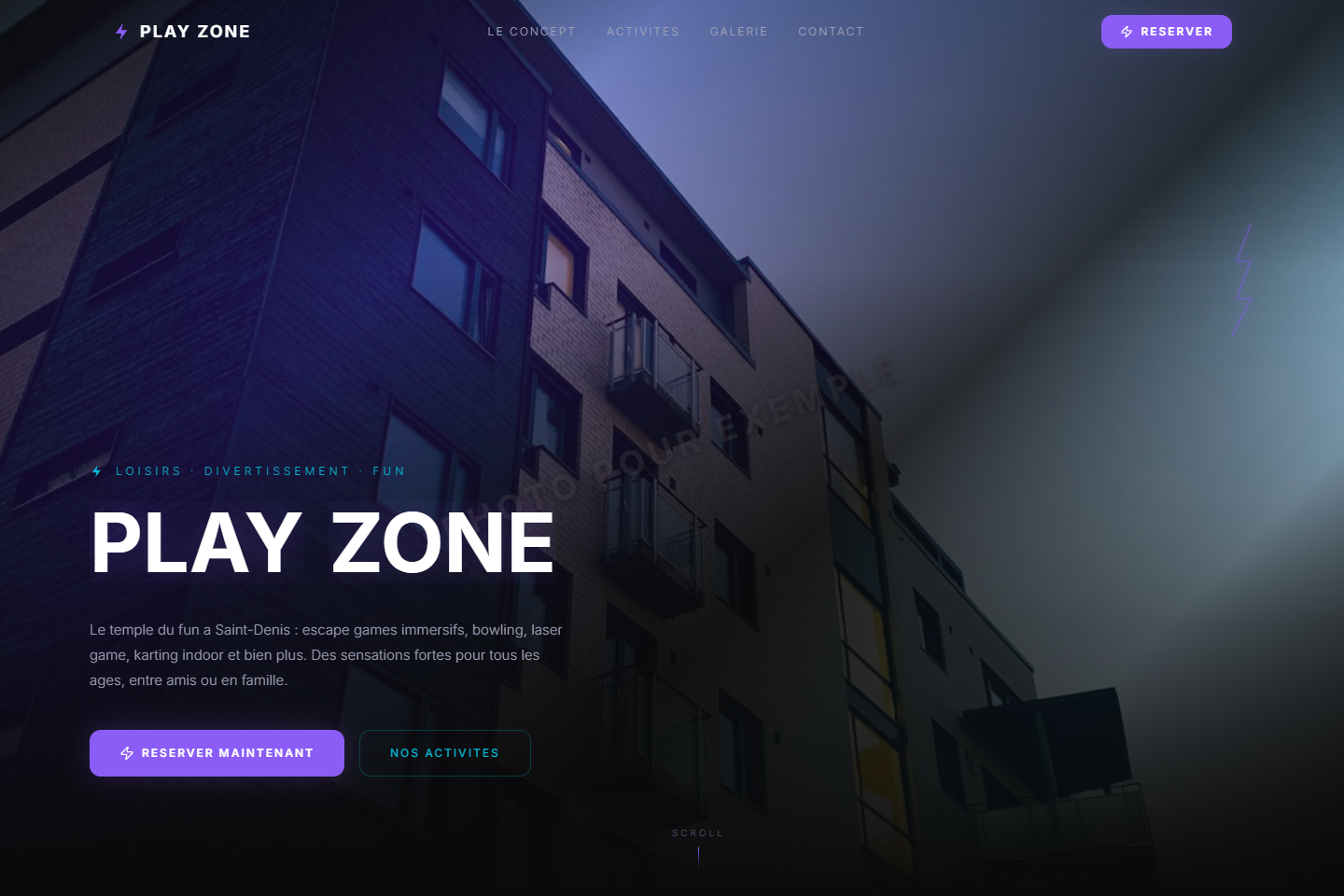 Design néon avec Inter bold, éclairs SVG, palette noir & violet électrique & cyan.