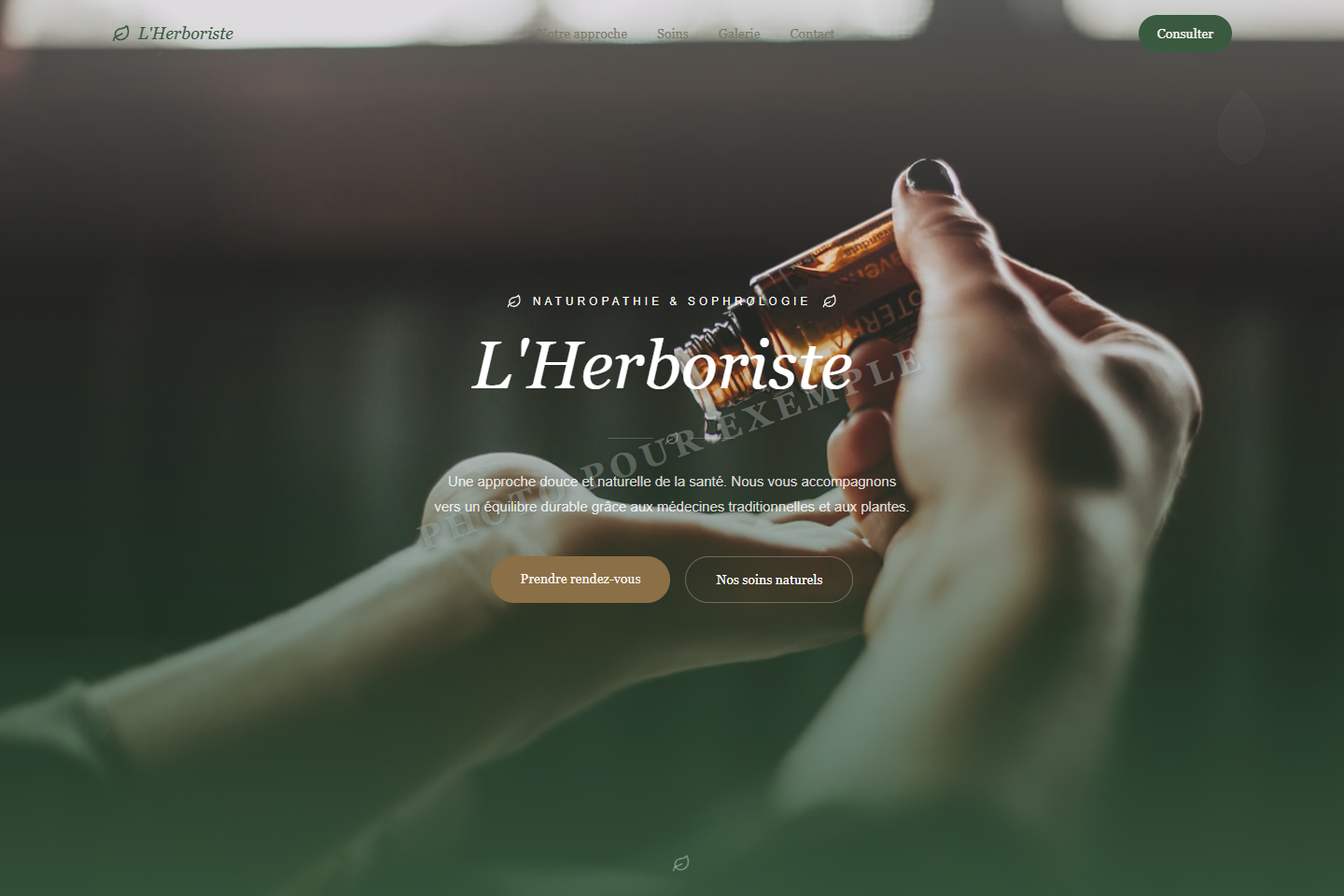 Design nature avec Newsreader italic, branches SVG, palette vert nature & terre et grow reveals.