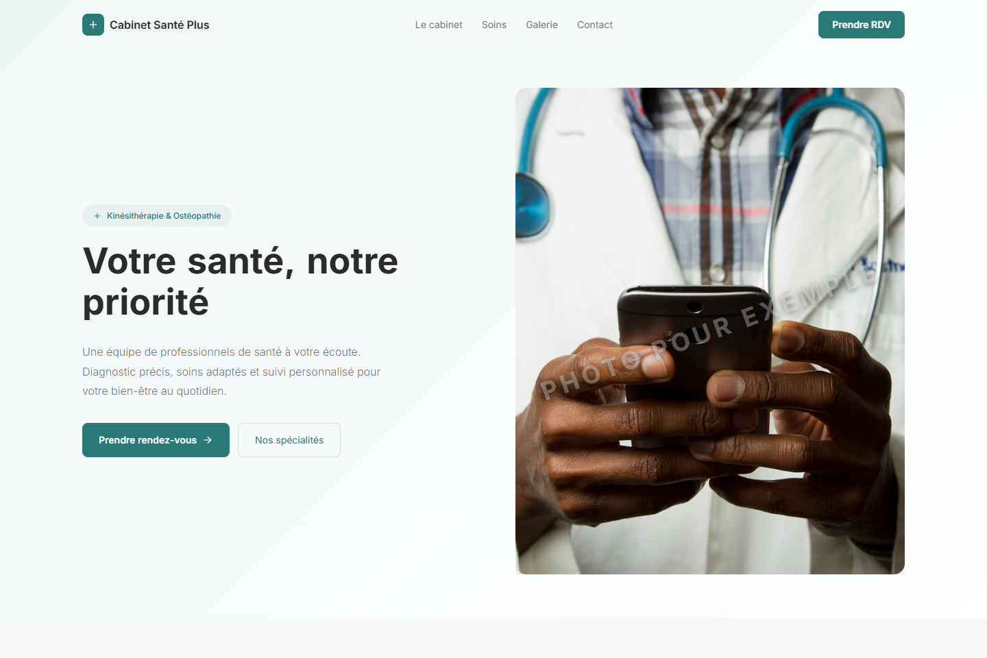 Design professionnel et rassurant avec palette teal, icône croix +, cards structurées et bandeau CTA.