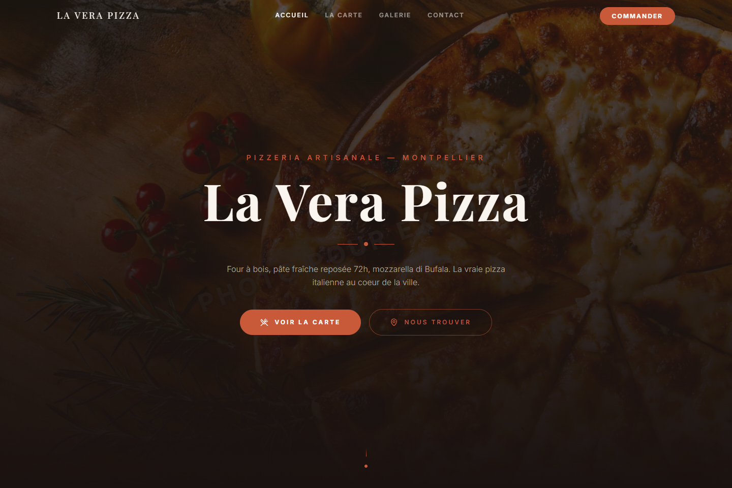 Animation pizza interactive au scroll — la part se détache en 3D. Ambiance trattoria chaleureuse.