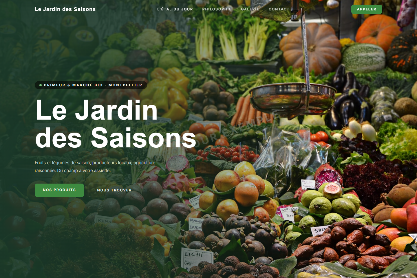 Style punchy et moderne avec hero produit flottant, menu visuel et design impactant.