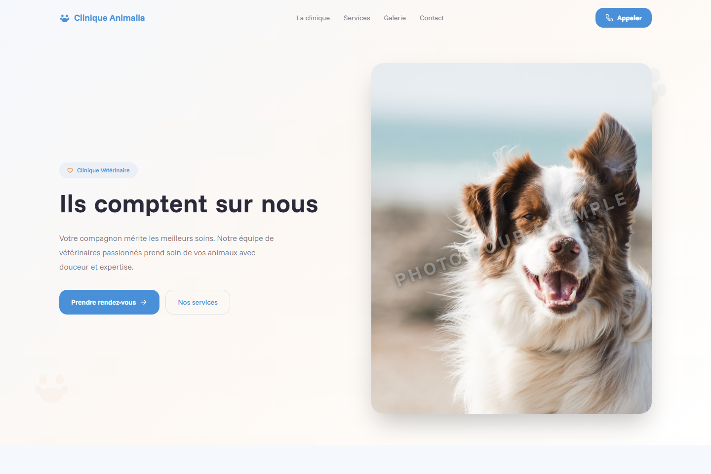 Design friendly et vivant avec paw prints SVG, palette bleu & orange, bounce animations et coins arrondis 3xl.